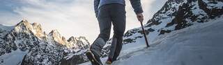 A man in snow mountains, wearing mountaineering gear.