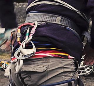 Modern climbing harnesses classically comprise of a high, padded waist belt and two leg loops connected by strong, reinforced pieces of webbing and elastic. The main purpose of a harness is to attach you to your rope and subsequent safety gear, comfortably arrest any falls and enable the user to hang in a seated position without tipping backwards or forwards.